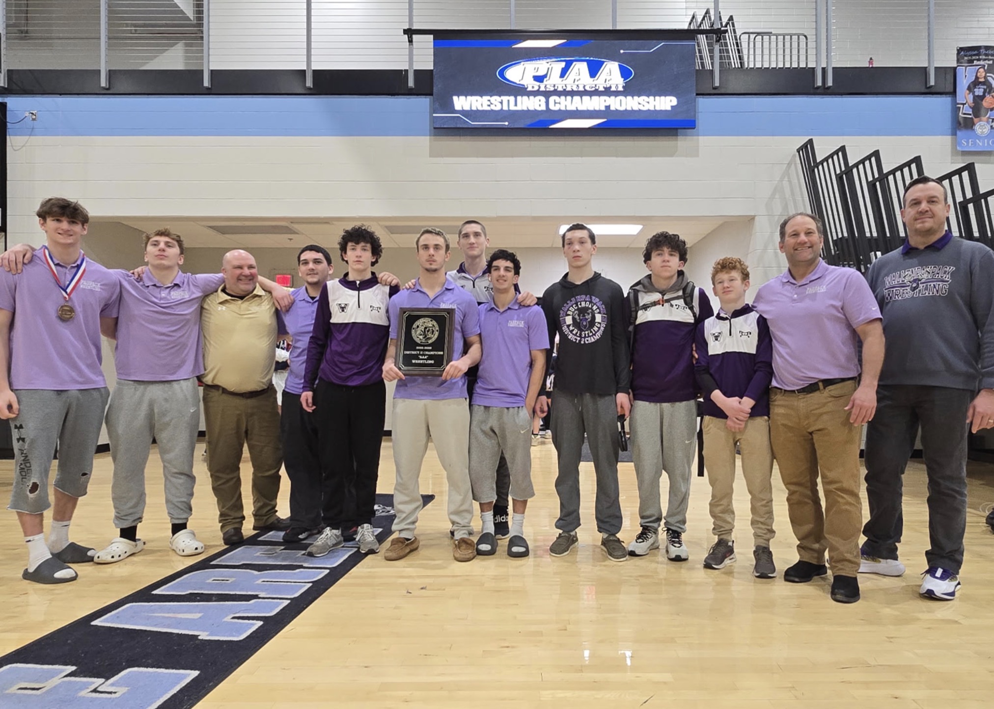 On February 20 and 21, members of the Wallenpaupack Boys Wrestling team took part in the District Two Triple A tournament at Wilkes-Barre Area High School. The team placed first overall for the third year in a row. There were 12 schools participating in the triple A tournament, and 13 boys from the Wallenpaupack Boys Wrestling team competed. 11 wrestlers from the Wallenpaupack Boys Wrestling team placed in the tournament, and eight wrestlers will be continuing onto the Northeast Regional Wrestling Championship, which is taking place this weekend at Liberty High School in Bethlehem. Special recognitions go out to senior Tyler Gallo, who had one of the biggest wins of the weekend, upsetting an Abington Heights wrestler to advance to the final which kept the team in the running for a title; Greg Nalesnik, who started the medal round with a pin in the first bout of that round; and senior Gabe Caufield, who received his first individual District Title. Additionally, congratulations to all the wrestlers who placed in the tournament in their respective weight classes: 1st: Gabe Caufield; 2nd: Ayden Blaut and Tyler Gallo; 3rd: Greg Nalesnik, Declan Brown, Gio Lomonaco, Kyle Scartelli, and Tristan Braxton; 4th: Jake Rafferty; 5th: Sawyer Jones; 6th: Colten Wilczewski.